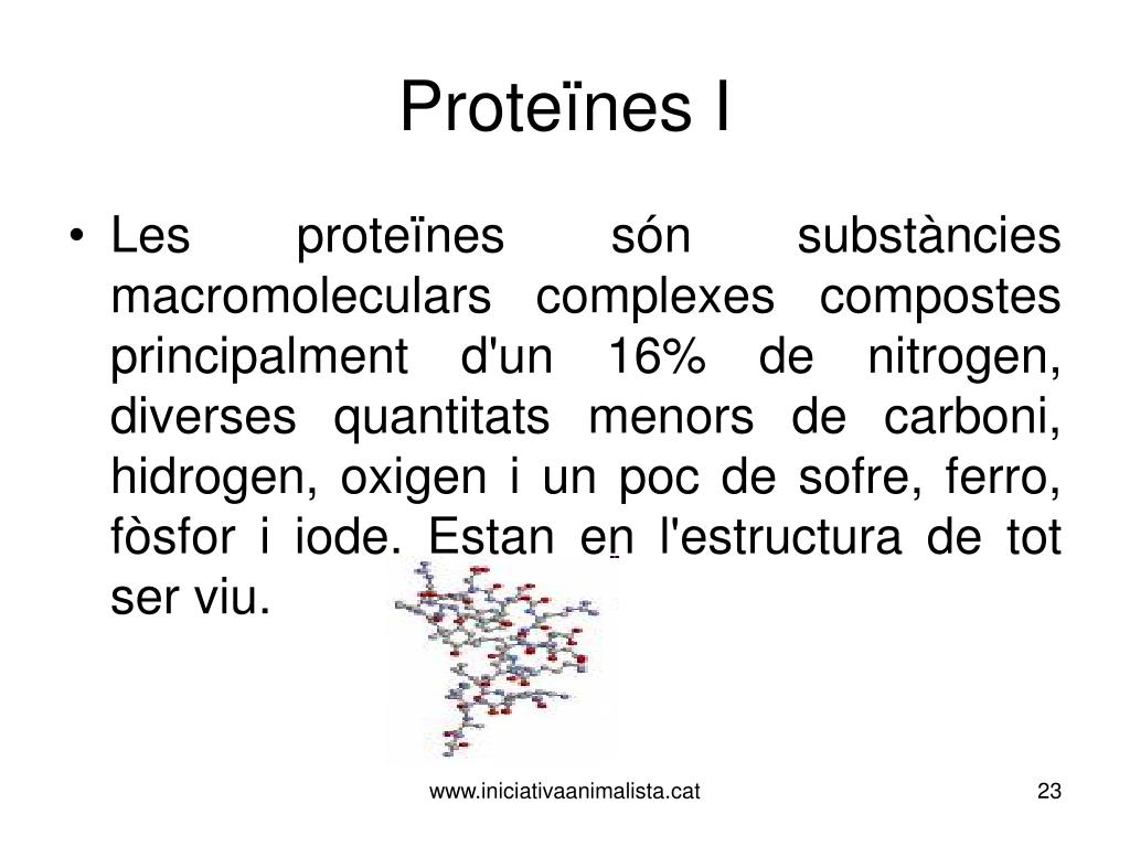 Proteïnes I • Les proteïnes són substàncies macromoleculars complexes compostes principalment d'un 16% de nitrogen, diverses quantitats menors de carboni, hidrogen, oxigen i un poc de sofre, ferro, fòsfor i iode. Estan en l'estructura de tot ser viu. www.iniciativaanimalista.cat