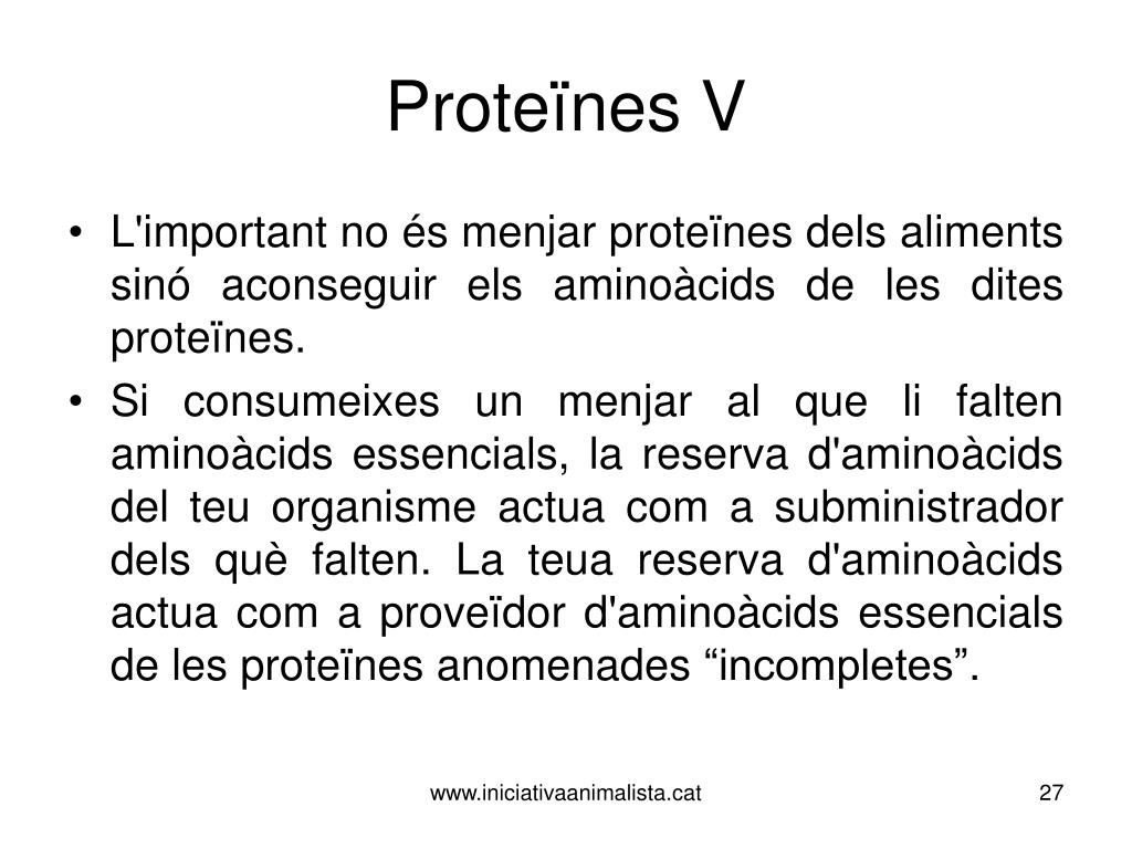 Proteïnes V • L'important no és menjar proteïnes dels aliments sinó aconseguir els aminoàcids de les dites proteïnes. • Si consumeixes un menjar al que li falten aminoàcids essencials, la reserva d'aminoàcids del teu organisme actua com a subministrador dels què falten. La teua reserva d'aminoàcids actua com a proveïdor d'aminoàcids essencials de les proteïnes anomenades “incompletes”. www.iniciativaanimalista.cat
