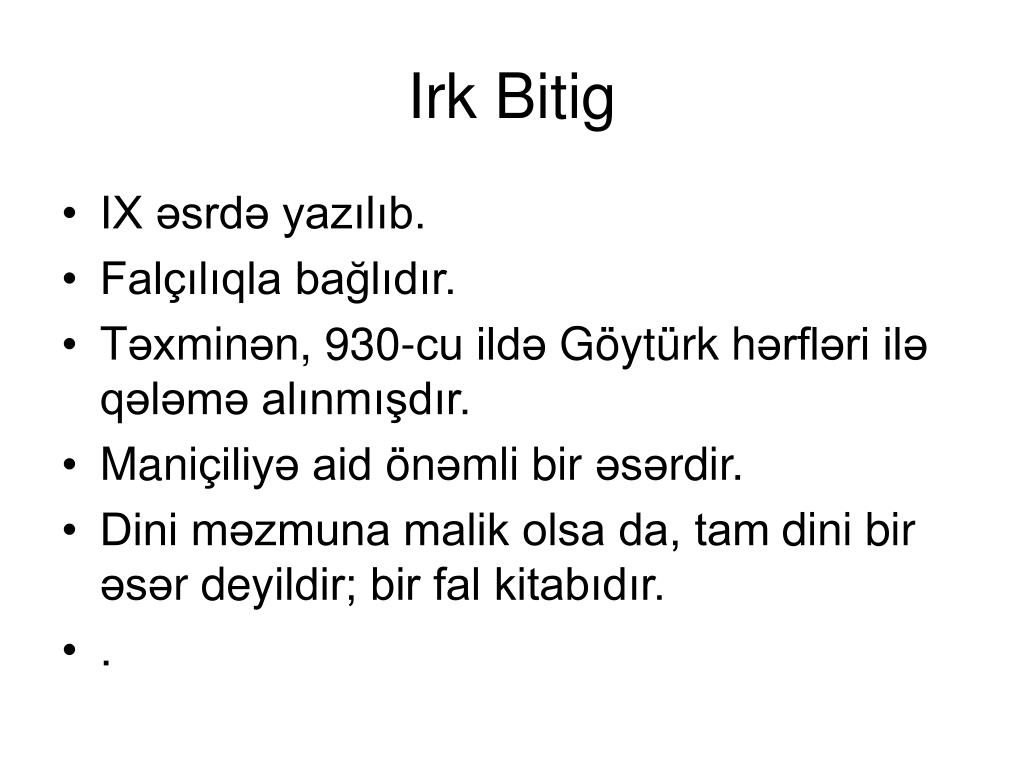 Irk Bitig • IX əsrdə yazılıb. • Falçılıqla bağlıdır. • Təxminən, 930-cu ildə Göytürk hərfləri ilə qələmə alınmışdır. • Maniçiliyə aid önəmli bir əsərdir. • Dini məzmuna malik olsa da, tam dini bir əsər deyildir; bir fal kitabıdır. • .