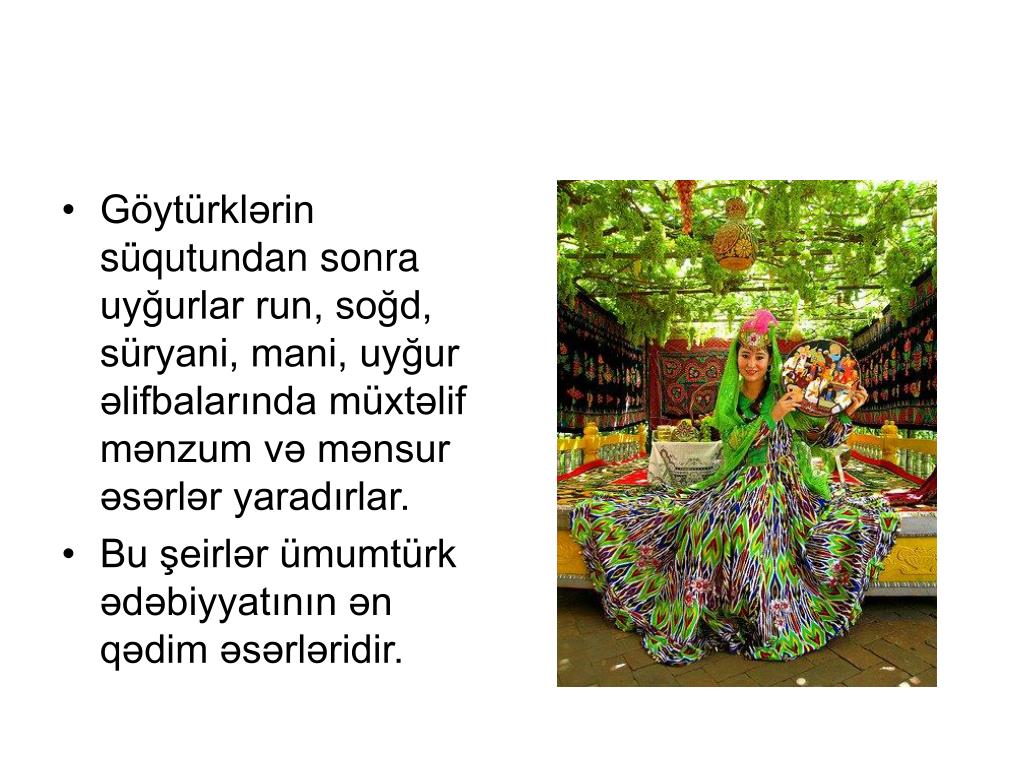 Göytürklərin süqutundan sonra uyğurlar run, soğd, süryani, mani, uyğur əlifbalarında müxtəlif mənzum və mənsur əsərlər yaradırlar. • Bu şeirlər ümumtürk ədəbiyyatının ən qədim əsərləridir.
