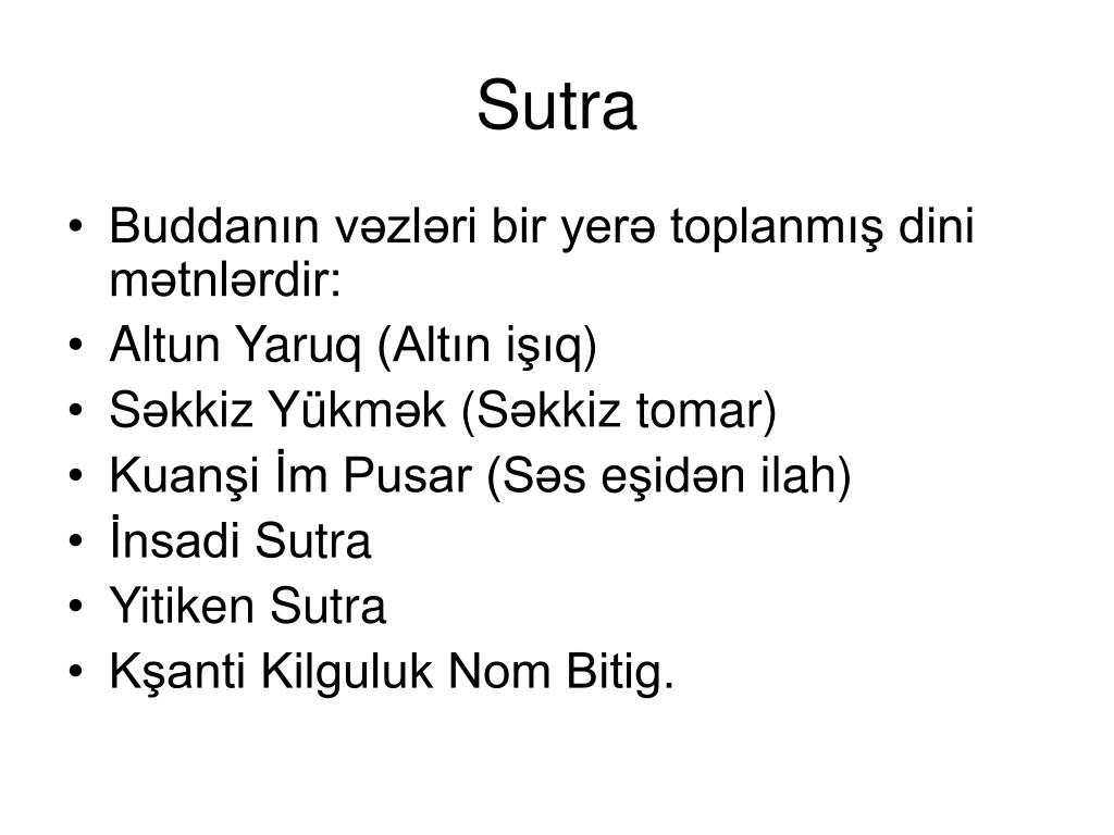 Sutra • Buddanın vəzləri bir yerə toplanmış dini mətnlərdir: • Altun Yaruq (Altın işıq) • Səkkiz Yükmək (Səkkiz tomar) • Kuanşi İm Pusar (Səs eşidən ilah) • İnsadi Sutra • Yitiken Sutra • Kşanti Kilguluk Nom Bitig.