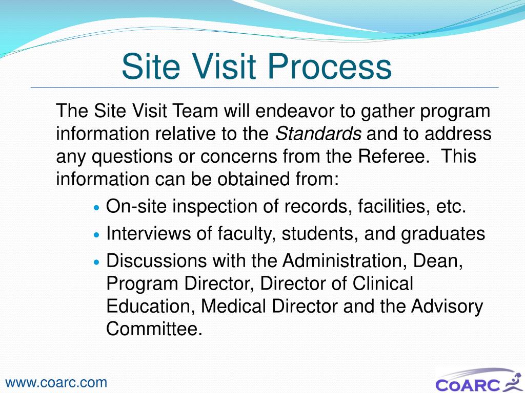 Site Visit Process www.coarc.com The Site Visit Team will endeavor to gather program information relative to the Standards and to address any questions or concerns from the Referee. This information can be obtained from: • On-site inspection of records, facilities, etc. • Interviews of faculty, students, and graduates • Discussions with the Administration, Dean, Program Director, Director of Clinical Education, Medical Director and the Advisory Committee.