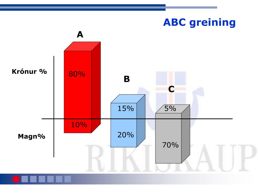 ABC greining A Krónur % 80% B C 15% 5% 10% 20% Magn% 70%