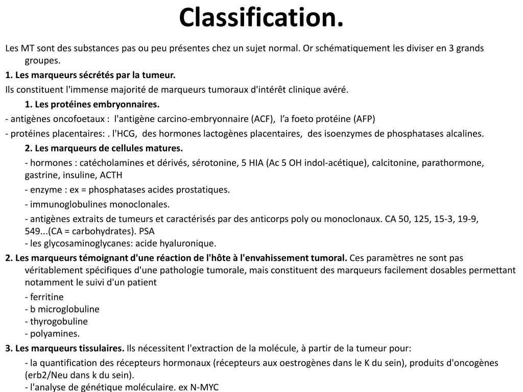 Classification. Les MT sont des substances pas oupeuprésentes chez un sujet normal. Or schématiquement les diviser en 3 grandsgroupes. 1. Les marqueurssécrétés par la tumeur. Ils constituent l'immensemajorité de marqueurstumorauxd'intérêtcliniqueavéré. 1. Les protéinesembryonnaires. - antigènesoncofoetaux: l'antigènecarcino-embryonnaire (ACF), l’afoetoprotéine (AFP) - protéinesplacentaires: . l'HCG, des hormones lactogènesplacentaires, des isoenzymes de phosphatasesalcalines. 2. Les marqueurs de cellules matures. - hormones : catécholamineset dérivés, sérotonine, 5 HIA (Ac 5 OH indol-acétique), calcitonine, parathormone, gastrine, insuline, ACTH - enzyme : ex = phosphatasesacidesprostatiques. - immunoglobulinesmonoclonales. - antigènesextraits de tumeurs et caractérisés par des anticorps poly oumonoclonaux. CA 50, 125, 15-3, 19-9, 549...(CA = carbohydrates). PSA- les glycosaminoglycanes: acidehyaluronique. 2. Les marqueurstémoignantd'uneréaction de l'hôte à l'envahissementtumoral. Cesparamètres ne sont pas véritablementspécifiquesd'unepathologietumorale, mais constituent des marqueursfacilementdosablespermettantnotamment le suivi d'un patient - ferritine- b microglobuline- thyrogobuline- polyamines. 3. Les marqueurstissulaires. Ilsnécessitentl'extraction de la molécule, à partir de la tumeur pour: - la quantification des récepteurshormonaux (récepteurs aux oestrogènesdans le K du sein), produitsd'oncogènes (erb2/Neudans k du sein).- l'analyse de génétiquemoléculaire. ex N-MYC