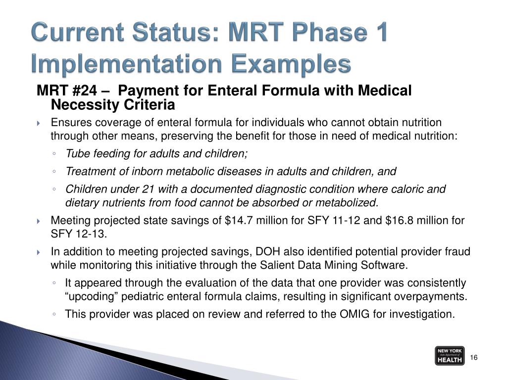 Current Status: MRT Phase 1Implementation Examples MRT #24 – Payment for Enteral Formula with Medical Necessity Criteria • Ensures coverage of enteral formula for individuals who cannot obtain nutrition through other means, preserving the benefit for those in need of medical nutrition: • Tube feeding for adults and children; • Treatment of inborn metabolic diseases in adults and children, and • Children under 21 with a documented diagnostic condition where caloric and dietary nutrients from food cannot be absorbed or metabolized. • Meeting projected state savings of $14.7 million for SFY 11-12 and $16.8 million for SFY 12-13. • In addition to meeting projected savings, DOH also identified potential provider fraud while monitoring this initiative through the Salient Data Mining Software. • It appeared through the evaluation of the data that one provider was consistently “upcoding” pediatric enteral formula claims, resulting in significant overpayments. • This provider was placed on review and referred to the OMIG for investigation. 16