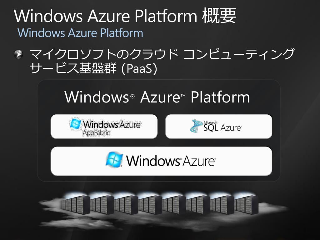 Windows Azure Platform 概要Windows AzurePlatform • マイクロソフトのクラウド コンピューティング サービス基盤群 (PaaS) Windows® Azure™ Platform
