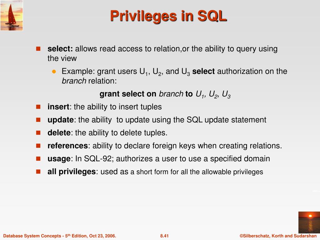 select: allows read access to relation,or the ability to query using the view Example: grant users U1, U2, and U3select authorization on the branch relation: grant select on branch to U1, U2, U3 insert: the ability to insert tuples update: the ability to update using the SQL update statement delete: the ability to delete tuples. references: ability to declare foreign keys when creating relations. usage: In SQL-92; authorizes a user to use a specified domain all privileges: used as a short form for all the allowable privileges Privileges in SQL