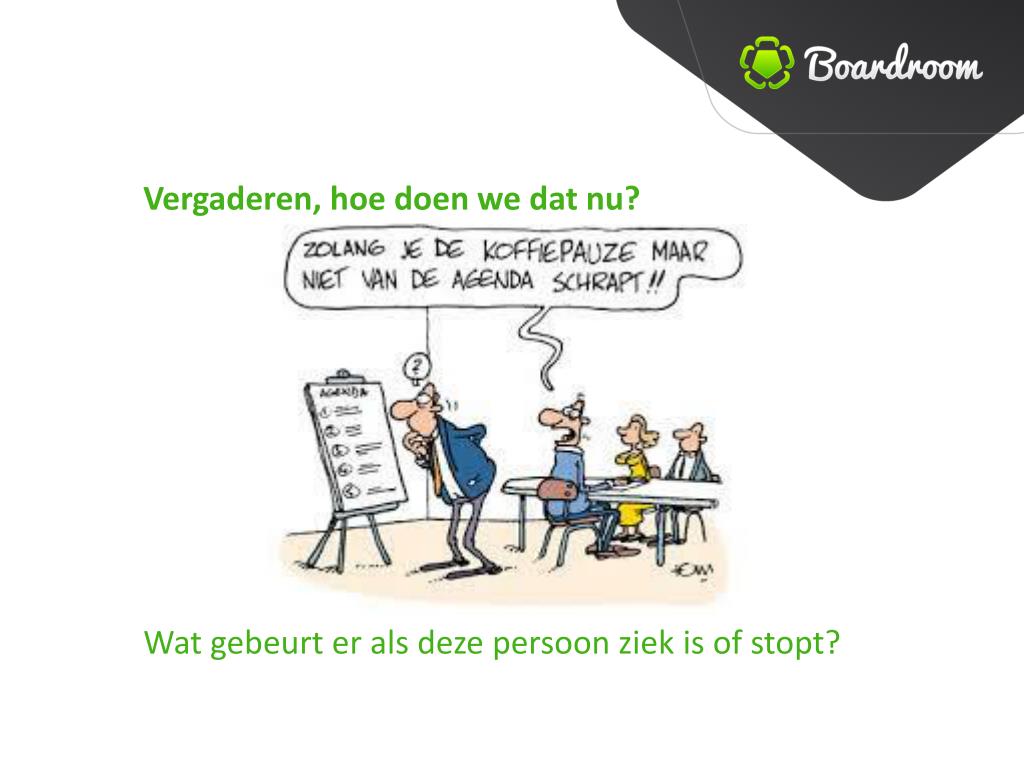 Wat is er anders met Boardroom • Kun je terugvinden waar je vorig • jaar over gesproken hebt? • Kun je het ook simpel vinden • als je zoekt wat er vorig jaar • (datum niet duidelijk) gezegd is • over sleutels van de • accommodatie punt.