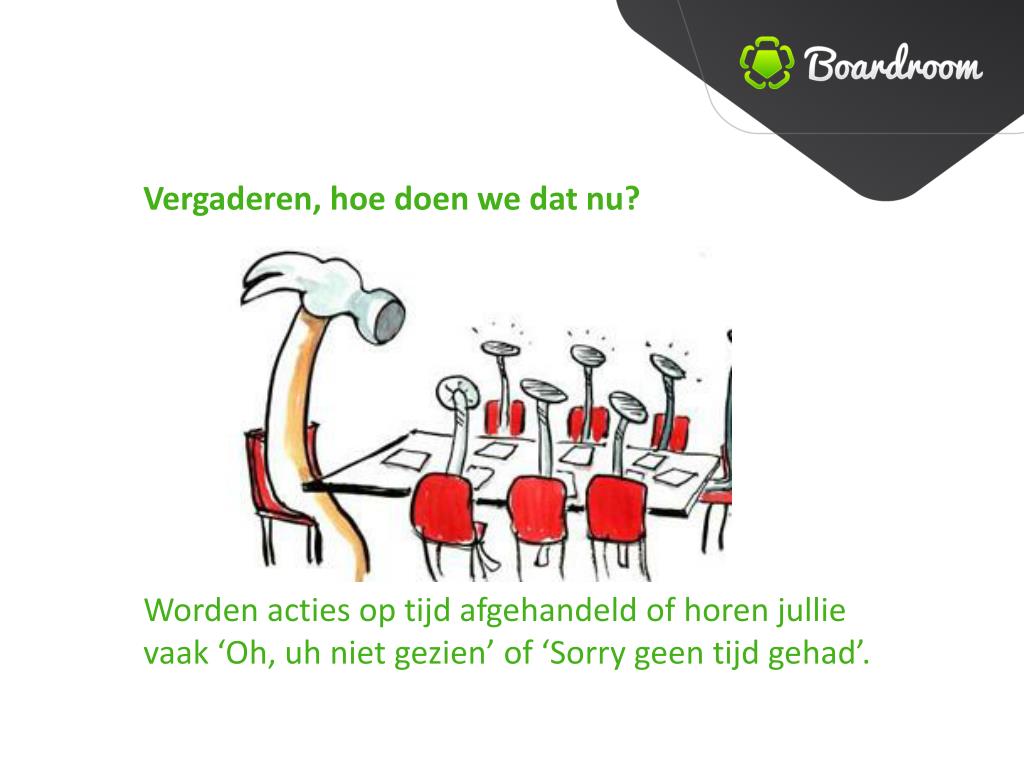 Vergaderen, hoe doen we dat nu? Worden acties op tijd afgehandeld of horen jullie vaak ‘Oh, uh niet gezien’ of ‘Sorry geen tijd gehad’.