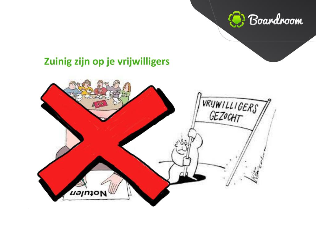 Zuinig zijn op je vrijwilliger • Complimenten geven • Het werk beperken en eenvoudig houden • De tijdsbesteding beperken • Zorgen dat deeltaken makkelijk overgedragen kunnen worden • De verantwoordelijkheid daar waar mogelijk beperken