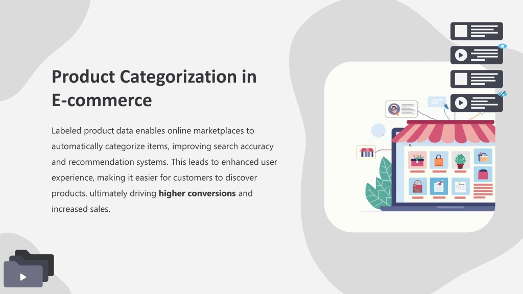 Product Categorization in E-commerce Labeled product data enables online marketplaces to automatically categorize items, improving search accuracy and recommendation systems. This leads to enhanced user experience, making it easier for customers to discover products, ultimately driving higher conversions and increased sales.
