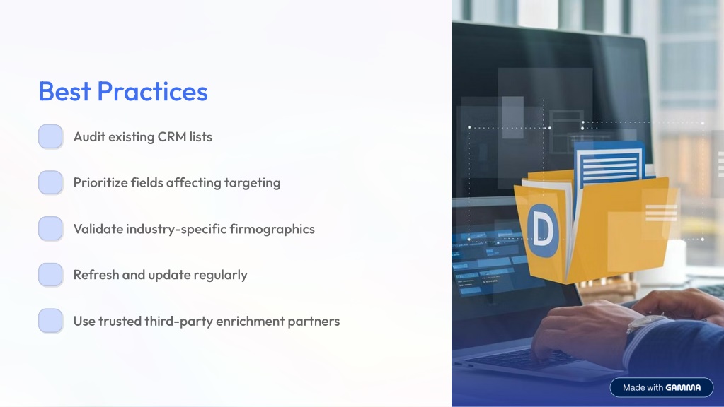 9. Best Practices Audit existing CRM lists Prioritize fields affecting targeting Validate industry-specific firmographics Refresh and update regularly Use trusted third-party enrichment partners