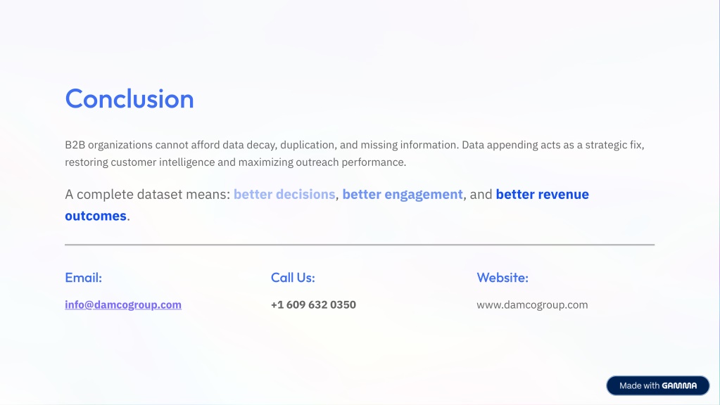 10. Conclusion B2B organizations cannot afford data decay, duplication, and missing information. Data appending acts as a strategic fix, restoring customer intelligence and maximizing outreach performance. A complete dataset means: better decisions, better engagement, and better revenue outcomes. Email: Call Us: Website: info@damcogroup.com +1 609 632 0350 www.damcogroup.com