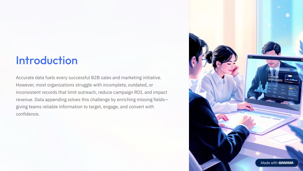 2. Introduction Accurate data fuels every successful B2B sales and marketing initiative. However, most organizations struggle with incomplete, outdated, or inconsistent records that limit outreach, reduce campaign ROI, and impact revenue. Data appending solves this challenge by enriching missing fields4 giving teams reliable information to target, engage, and convert with confidence.