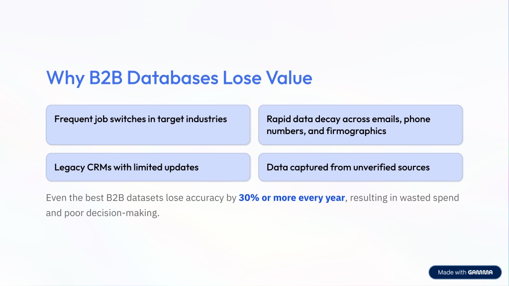 3. Why B2B Databases Lose Value Frequent job switches in target industries Rapid data decay across emails, phone numbers, and firmographics Legacy CRMs with limited updates Data captured from unverified sources Even the best B2B datasets lose accuracy by 30% or more every year, resulting in wasted spend and poor decision-making.
