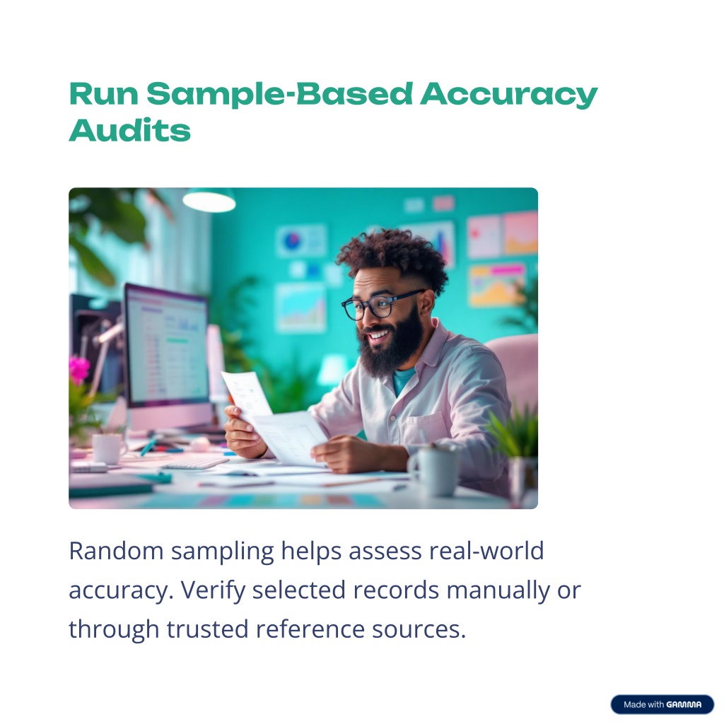 7. Run Sample-Based Accuracy Audits Random sampling helps assess real-world accuracy. Verify selected records manually or through trusted reference sources.
