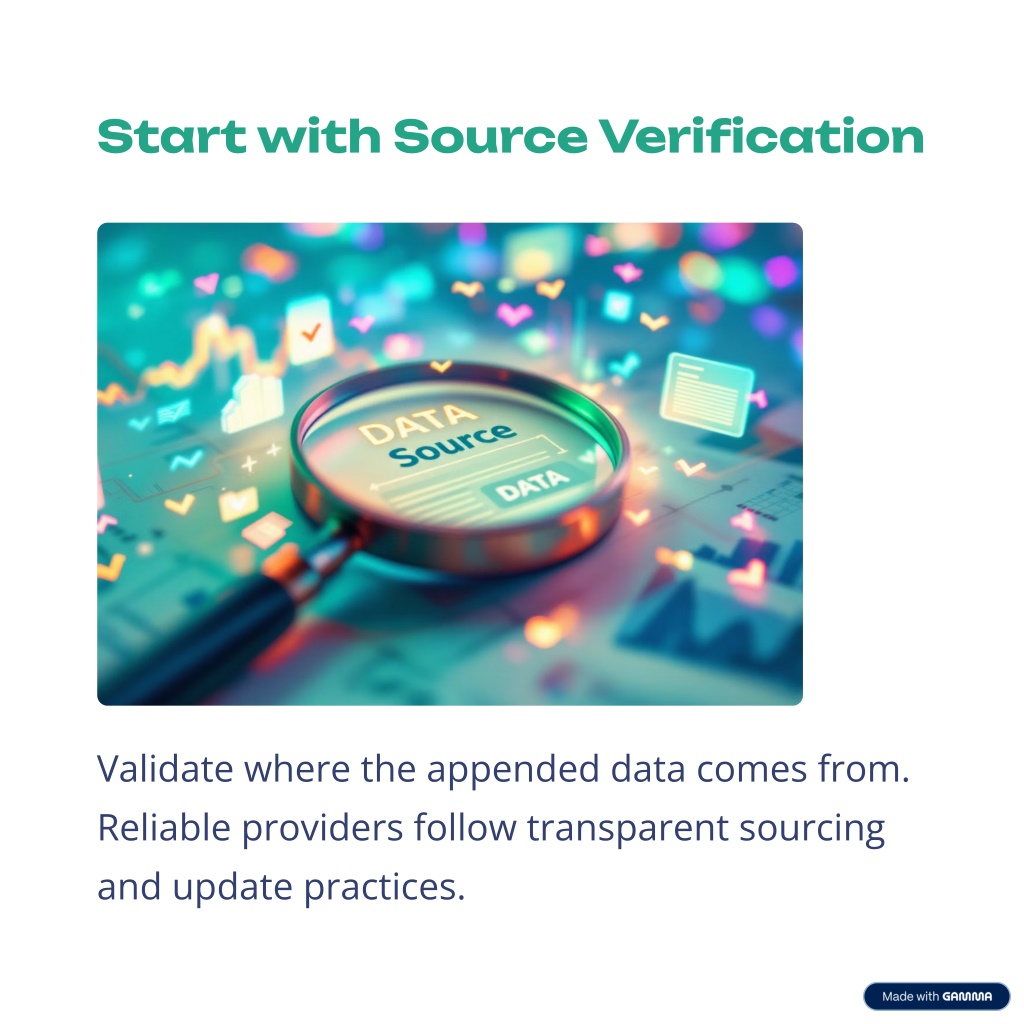 3. Start with Source Verification Validate where the appended data comes from. Reliable providers follow transparent sourcing and update practices.