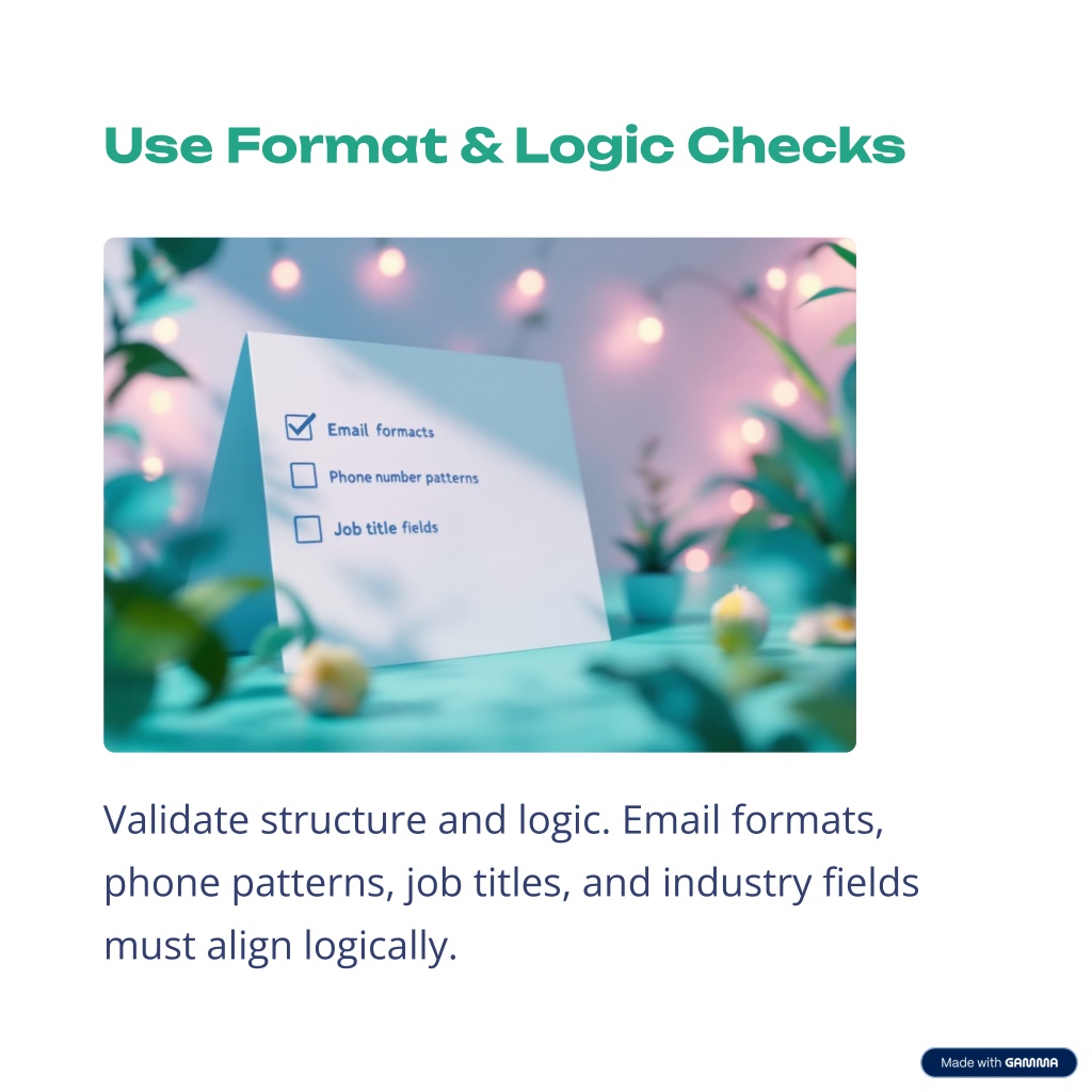 6. Use Format & Logic Checks Validate structure and logic. Email formats, phone patterns, job titles, and industry fields must align logically.