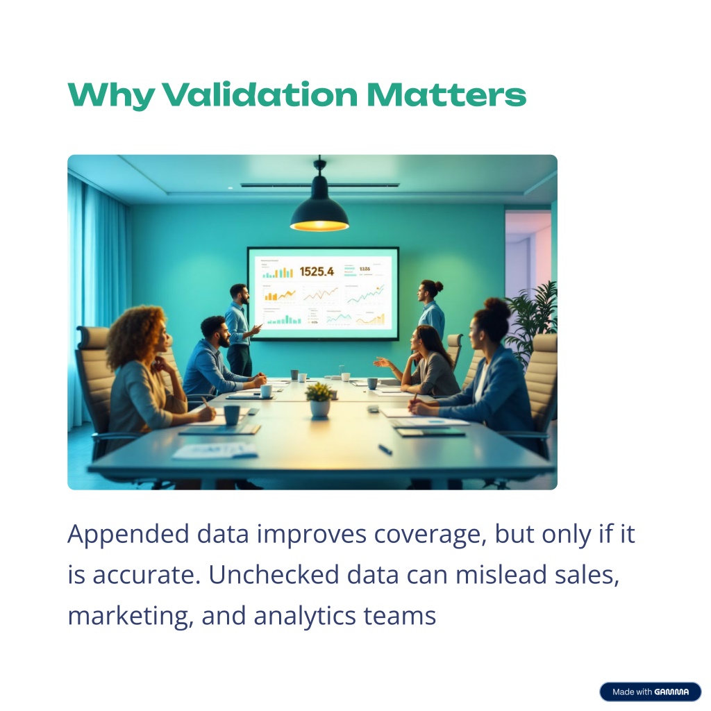 2. Why Validation Matters Appended data improves coverage, but only if it is accurate. Unchecked data can mislead sales, marketing, and analytics teams