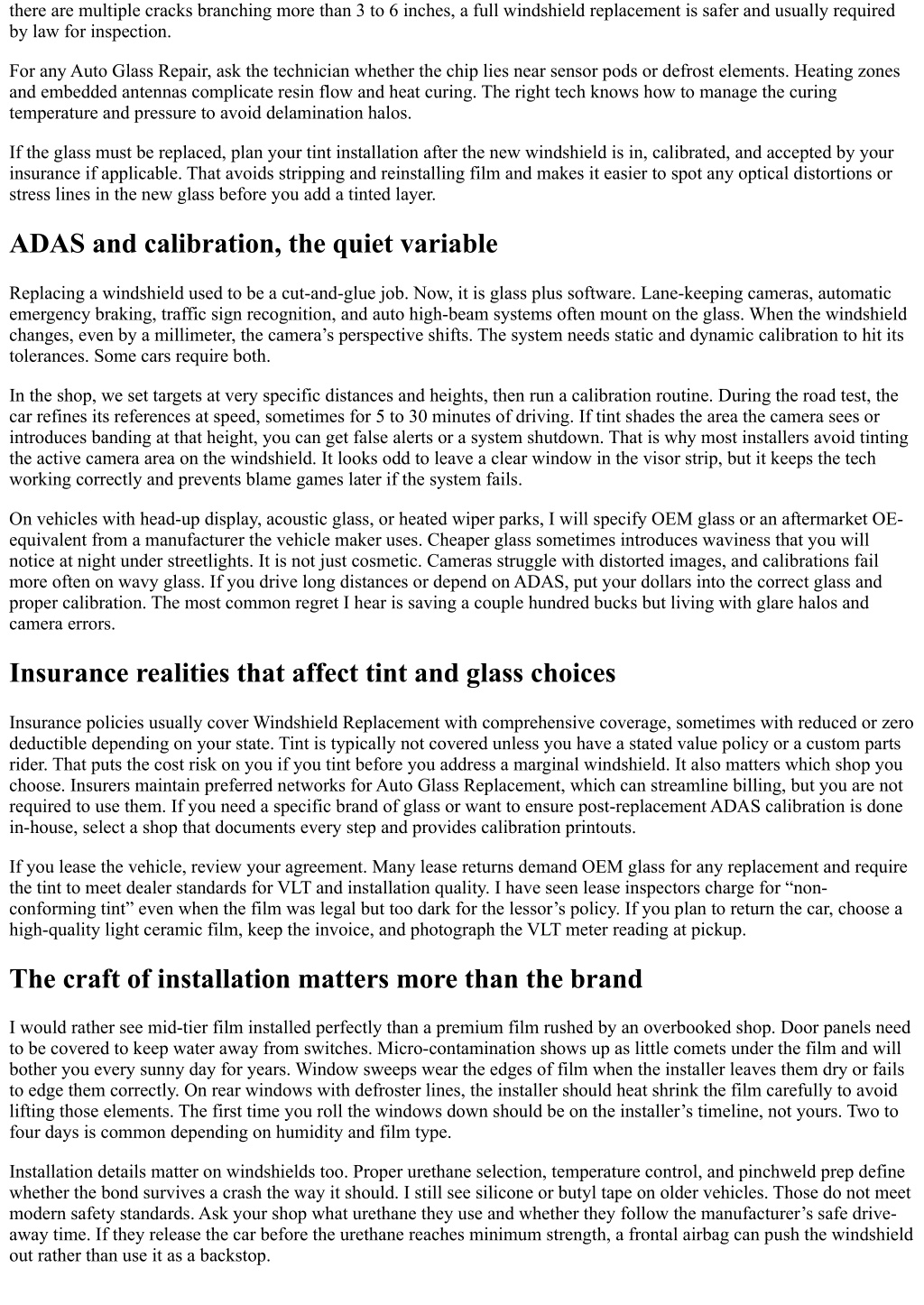 there are multiple cracks branching more than 3 to 6 inches, a full windshield replacement is safer and usually required by law for inspection. For any Auto Glass Repair, ask the technician whether the chip lies near sensor pods or defrost elements. Heating zones and embedded antennas complicate resin flow and heat curing. The right tech knows how to manage the curing temperature and pressure to avoid delamination halos. If the glass must be replaced, plan your tint installation after the new windshield is in, calibrated, and accepted by your insurance if applicable. That avoids stripping and reinstalling film and makes it easier to spot any optical distortions or stress lines in the new glass before you add a tinted layer. ADAS and calibration, the quiet variable Replacing a windshield used to be a cut-and-glue job. Now, it is glass plus software. Lane-keeping cameras, automatic emergency braking, traffic sign recognition, and auto high-beam systems often mount on the glass. When the windshield changes, even by a millimeter, the camera’s perspective shifts. The system needs static and dynamic calibration to hit its tolerances. Some cars require both. In the shop, we set targets at very specific distances and heights, then run a calibration routine. During the road test, the car refines its references at speed, sometimes for 5 to 30 minutes of driving. If tint shades the area the camera sees or introduces banding at that height, you can get false alerts or a system shutdown. That is why most installers avoid tinting the active camera area on the windshield. It looks odd to leave a clear window in the visor strip, but it keeps the tech working correctly and prevents blame games later if the system fails. On vehicles with head-up display, acoustic glass, or heated wiper parks, I will specify OEM glass or an aftermarket OE- equivalent from a manufacturer the vehicle maker uses. Cheaper glass sometimes introduces waviness that you will notice at night under streetlights. It is not just cosmetic. Cameras struggle with distorted images, and calibrations fail more often on wavy glass. If you drive long distances or depend on ADAS, put your dollars into the correct glass and proper calibration. The most common regret I hear is saving a couple hundred bucks but living with glare halos and camera errors. Insurance realities that affect tint and glass choices Insurance policies usually cover Windshield Replacement with comprehensive coverage, sometimes with reduced or zero deductible depending on your state. Tint is typically not covered unless you have a stated value policy or a custom parts rider. That puts the cost risk on you if you tint before you address a marginal windshield. It also matters which shop you choose. Insurers maintain preferred networks for Auto Glass Replacement, which can streamline billing, but you are not required to use them. If you need a specific brand of glass or want to ensure post-replacement ADAS calibration is done in-house, select a shop that documents every step and provides calibration printouts. If you lease the vehicle, review your agreement. Many lease returns demand OEM glass for any replacement and require the tint to meet dealer standards for VLT and installation quality. I have seen lease inspectors charge for “non- conforming tint” even when the film was legal but too dark for the lessor’s policy. If you plan to return the car, choose a high-quality light ceramic film, keep the invoice, and photograph the VLT meter reading at pickup. The craft of installation matters more than the brand I would rather see mid-tier film installed perfectly than a premium film rushed by an overbooked shop. Door panels need to be covered to keep water away from switches. Micro-contamination shows up as little comets under the film and will bother you every sunny day for years. Window sweeps wear the edges of film when the installer leaves them dry or fails to edge them correctly. On rear windows with defroster lines, the installer should heat shrink the film carefully to avoid lifting those elements. The first time you roll the windows down should be on the installer’s timeline, not yours. Two to four days is common depending on humidity and film type. Installation details matter on windshields too. Proper urethane selection, temperature control, and pinchweld prep define whether the bond survives a crash the way it should. I still see silicone or butyl tape on older vehicles. Those do not meet modern safety standards. Ask your shop what urethane they use and whether they follow the manufacturer’s safe drive- away time. If they release the car before the urethane reaches minimum strength, a frontal airbag can push the windshield out rather than use it as a backstop.