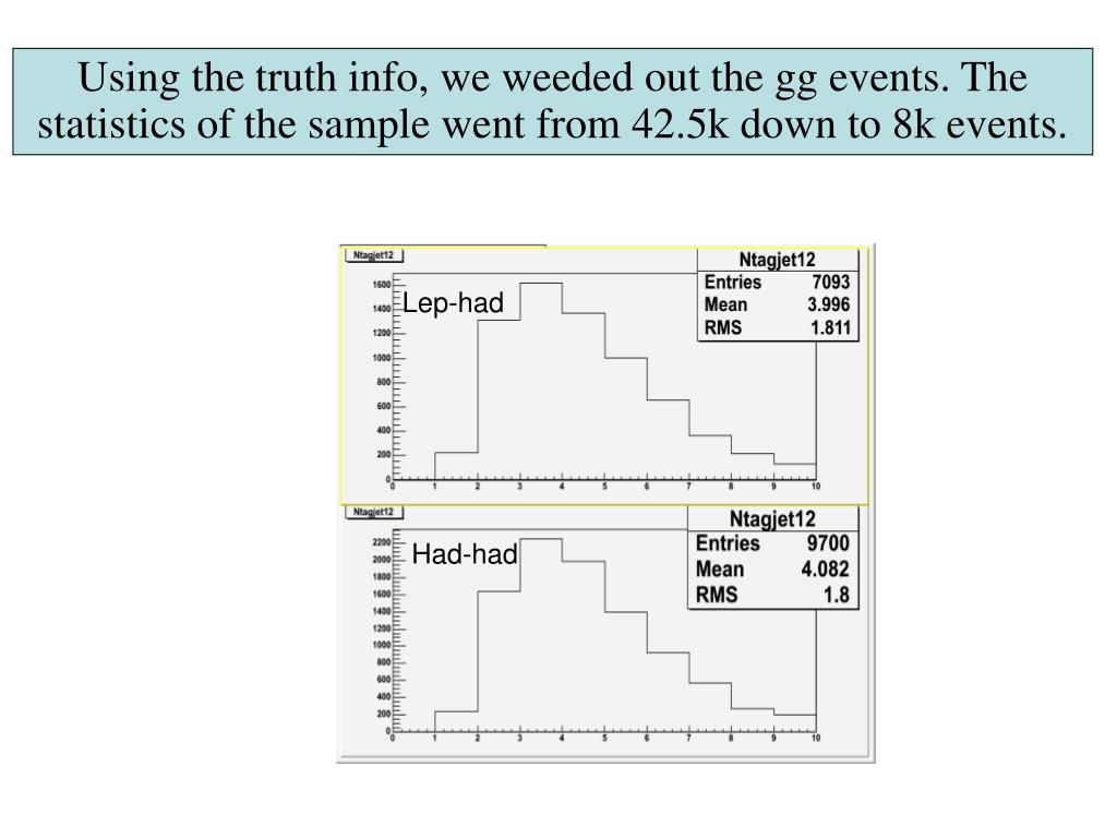 Lep-had Had-had Using the truth info, we weeded out the gg events. The statistics of the sample went from 42.5k down to 8k events.