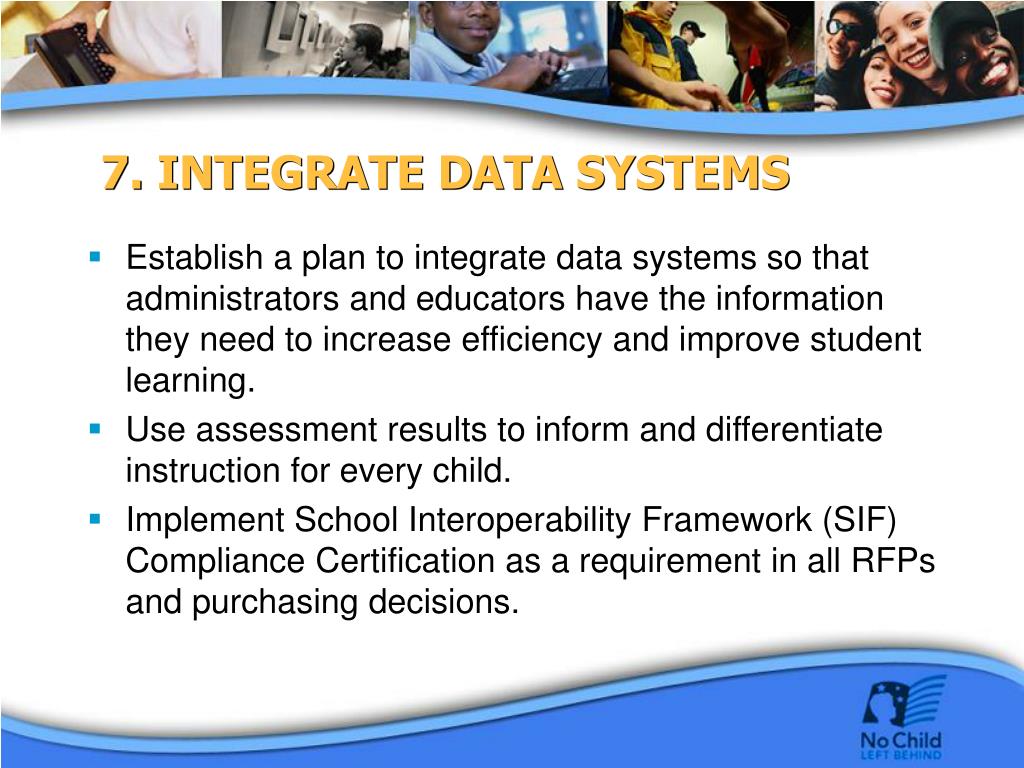 7. INTEGRATE DATA SYSTEMS • Establish a plan to integrate data systems so that administrators and educators have the information they need to increase efficiency and improve student learning. • Use assessment results to inform and differentiate instruction for every child. • Implement School Interoperability Framework (SIF) Compliance Certification as a requirement in all RFPs and purchasing decisions.