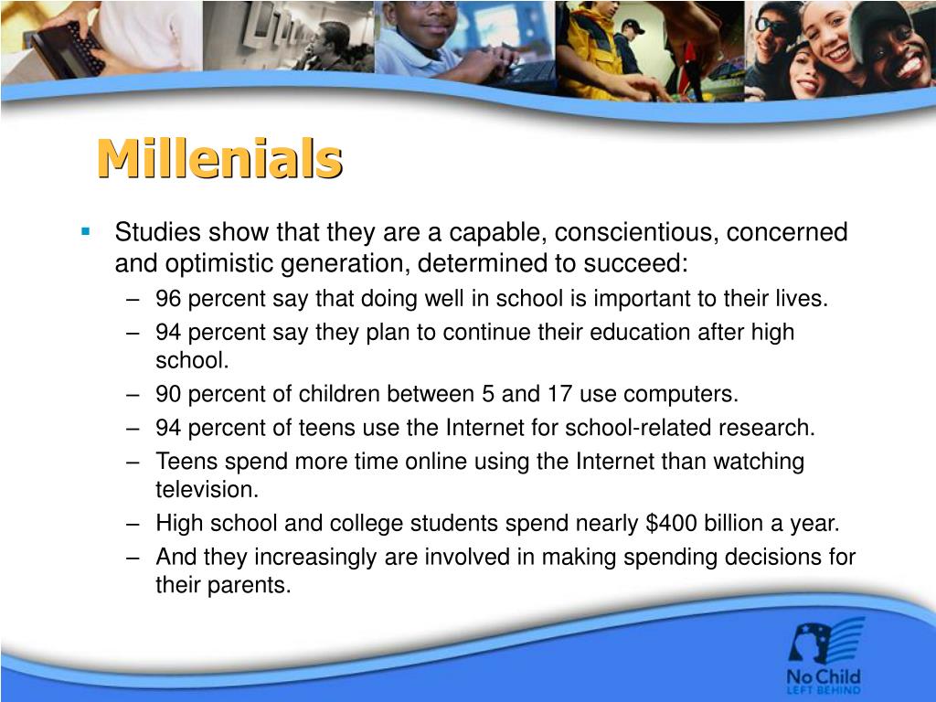 Millenials • Studies show that they are a capable, conscientious, concerned and optimistic generation, determined to succeed: • 96 percent say that doing well in school is important to their lives. • 94 percent say they plan to continue their education after high school. • 90 percent of children between 5 and 17 use computers. • 94 percent of teens use the Internet for school-related research. • Teens spend more time online using the Internet than watching television. • High school and college students spend nearly $400 billion a year. • And they increasingly are involved in making spending decisions for their parents.