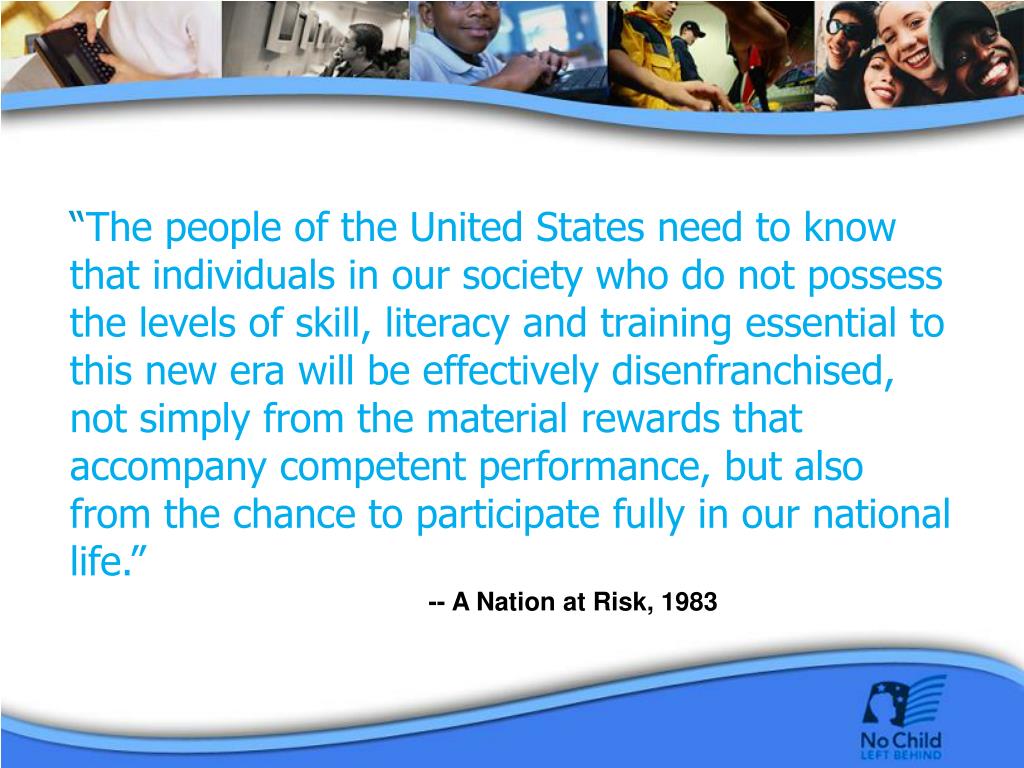 “The people of the United States need to know that individuals in our society who do not possess the levels of skill, literacy and training essential to this new era will be effectively disenfranchised, not simply from the material rewards that accompany competent performance, but also from the chance to participate fully in our national life.” -- A Nation at Risk, 1983