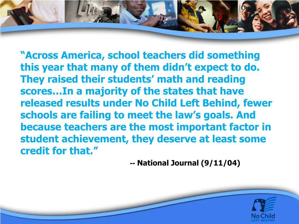 “Across America, school teachers did something this year that many of them didn’t expect to do. They raised their students’ math and reading scores…In a majority of the states that have released results under No Child Left Behind, fewer schools are failing to meet the law’s goals. And because teachers are the most important factor in student achievement, they deserve at least some credit for that.” -- National Journal (9/11/04)