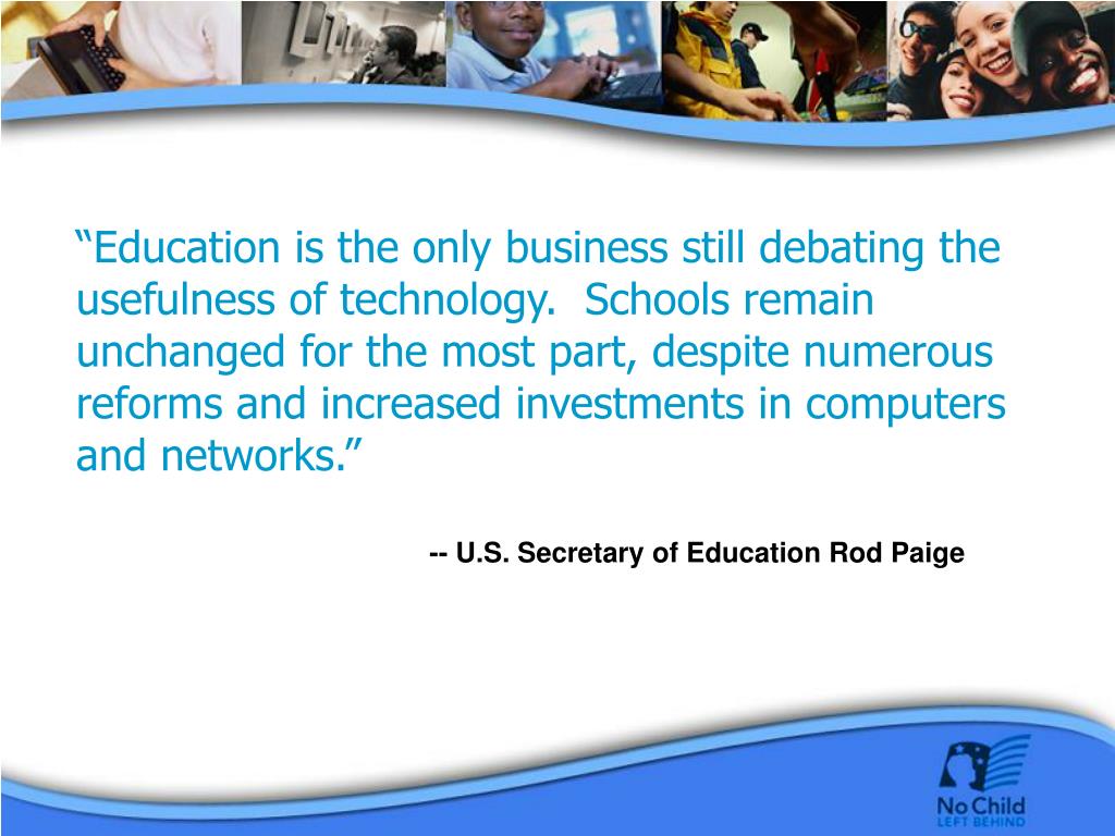 “Education is the only business still debating the usefulness of technology. Schools remain unchanged for the most part, despite numerous reforms and increased investments in computers and networks.” -- U.S. Secretary of Education Rod Paige
