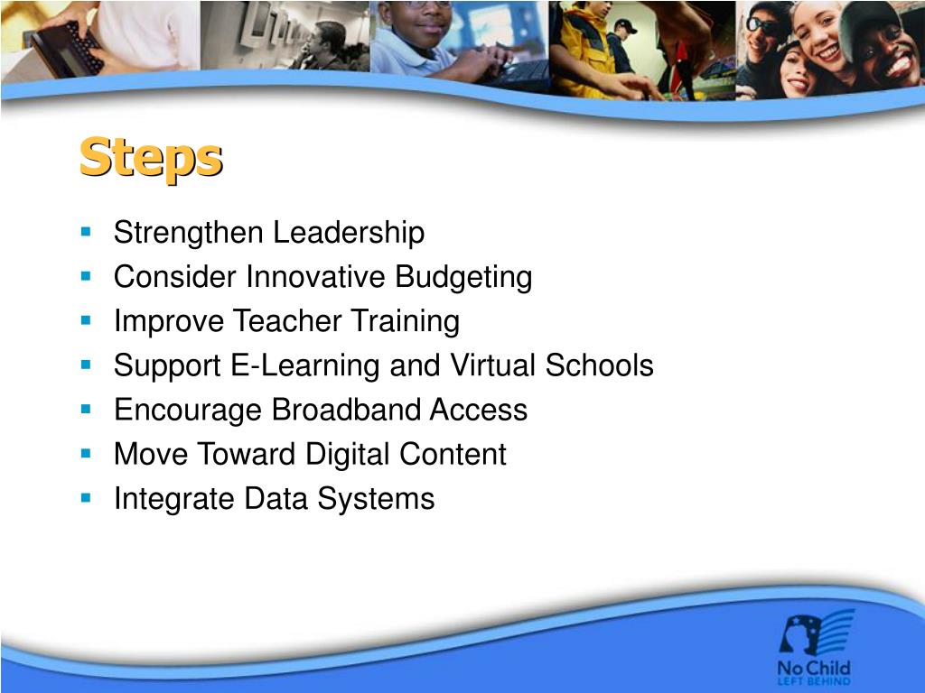 Steps • Strengthen Leadership • Consider Innovative Budgeting • Improve Teacher Training • Support E-Learning and Virtual Schools • Encourage Broadband Access • Move Toward Digital Content • Integrate Data Systems