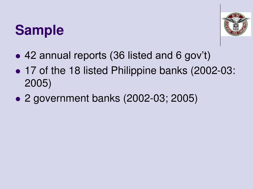 Sample • 42 annual reports (36 listed and 6 gov’t) • 17 of the 18 listed Philippine banks (2002-03: 2005) • 2 government banks (2002-03; 2005)