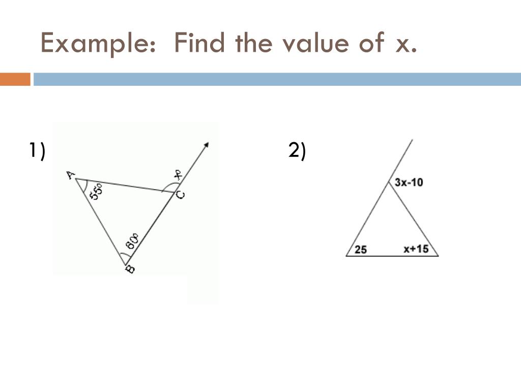 Triangle Angle Sum Theorem The interior angles of a triangle sum to 180º. Solve for x: