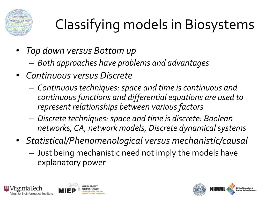 Classifying models in Biosystems • Top down versus Bottom up • Both approaches have problems and advantages • Continuous versus Discrete • Continuous techniques: space and time is continuous and continuous functions and differential equations are used to represent relationships between various factors • Discrete techniques: space and time is discrete: Boolean networks, CA, network models, Discrete dynamical systems • Statistical/Phenomenological versus mechanistic/causal • Just being mechanistic need not imply the models have explanatory power