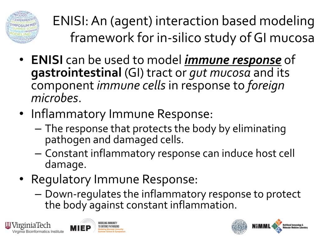 ENISI: An (agent) interaction based modeling framework for in-silico study of GI mucosa • ENISIcan be used to model immune response of gastrointestinal(GI) tract or gut mucosa and its component immune cells in response to foreign microbes. • Inflammatory Immune Response: • The response that protects the body by eliminating pathogen and damaged cells. • Constant inflammatory response can induce host cell damage. • Regulatory Immune Response: • Down-regulates the inflammatory response to protect the body against constant inflammation.