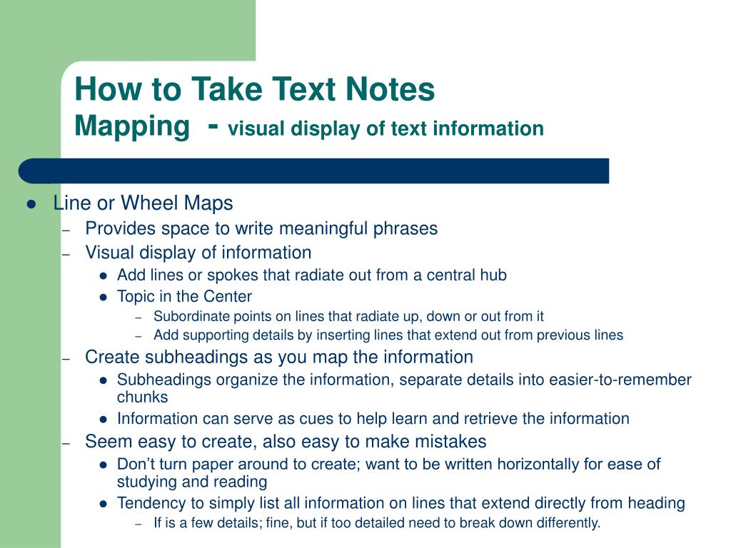 How to Take Text NotesMapping - visual display of text information • Line or Wheel Maps • Provides space to write meaningful phrases • Visual display of information • Add lines or spokes that radiate out from a central hub • Topic in the Center • Subordinate points on lines that radiate up, down or out from it • Add supporting details by inserting lines that extend out from previous lines • Create subheadings as you map the information • Subheadings organize the information, separate details into easier-to-remember chunks • Information can serve as cues to help learn and retrieve the information • Seem easy to create, also easy to make mistakes • Don’t turn paper around to create; want to be written horizontally for ease of studying and reading • Tendency to simply list all information on lines that extend directly from heading • If is a few details; fine, but if too detailed need to break down differently.