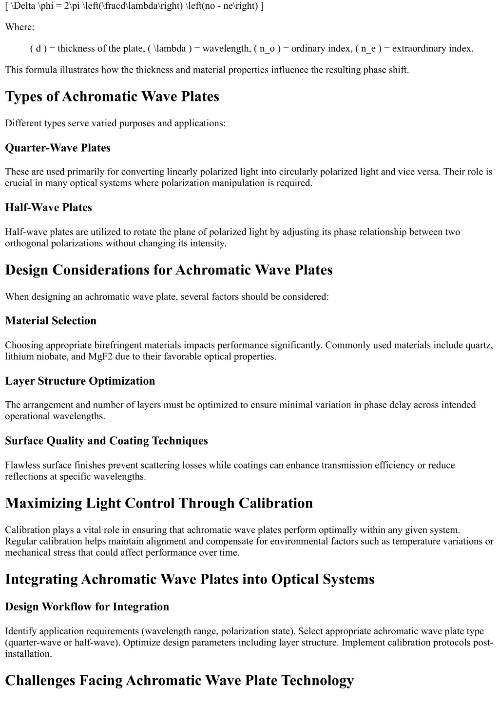 [ \Delta \phi = 2\pi \left(\fracd\lambda\right) \left(no - ne\right) ] Where: ( d ) = thickness of the plate, ( \lambda ) = wavelength, ( n_o ) = ordinary index, ( n_e ) = extraordinary index. This formula illustrates how the thickness and material properties influence the resulting phase shift. Types of Achromatic Wave Plates Different types serve varied purposes and applications: Quarter-Wave Plates These are used primarily for converting linearly polarized light into circularly polarized light and vice versa. Their role is crucial in many optical systems where polarization manipulation is required. Half-Wave Plates Half-wave plates are utilized to rotate the plane of polarized light by adjusting its phase relationship between two orthogonal polarizations without changing its intensity. Design Considerations for Achromatic Wave Plates When designing an achromatic wave plate, several factors should be considered: Material Selection Choosing appropriate birefringent materials impacts performance significantly. Commonly used materials include quartz, lithium niobate, and MgF2 due to their favorable optical properties. Layer Structure Optimization The arrangement and number of layers must be optimized to ensure minimal variation in phase delay across intended operational wavelengths. Surface Quality and Coating Techniques Flawless surface finishes prevent scattering losses while coatings can enhance transmission efficiency or reduce reflections at specific wavelengths. Maximizing Light Control Through Calibration Calibration plays a vital role in ensuring that achromatic wave plates perform optimally within any given system. Regular calibration helps maintain alignment and compensate for environmental factors such as temperature variations or mechanical stress that could affect performance over time. Integrating Achromatic Wave Plates into Optical Systems Design Workflow for Integration Identify application requirements (wavelength range, polarization state). Select appropriate achromatic wave plate type (quarter-wave or half-wave). Optimize design parameters including layer structure. Implement calibration protocols post- installation. Challenges Facing Achromatic Wave Plate Technology