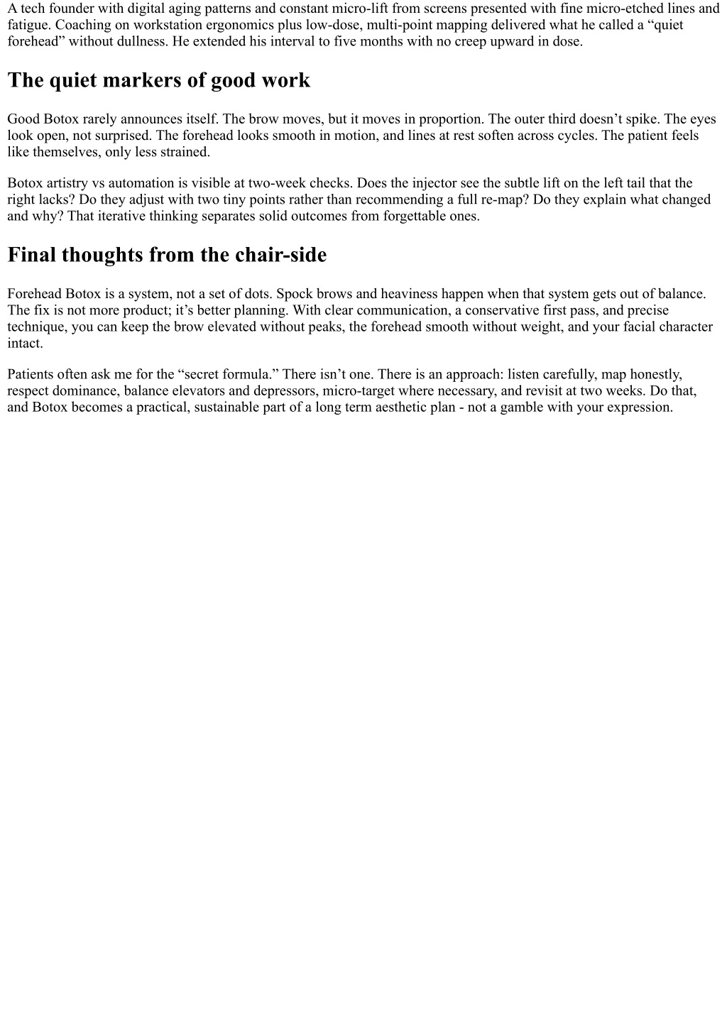 A tech founder with digital aging patterns and constant micro-lift from screens presented with fine micro-etched lines and fatigue. Coaching on workstation ergonomics plus low-dose, multi-point mapping delivered what he called a “quiet forehead” without dullness. He extended his interval to five months with no creep upward in dose. The quiet markers of good work Good Botox rarely announces itself. The brow moves, but it moves in proportion. The outer third doesn’t spike. The eyes look open, not surprised. The forehead looks smooth in motion, and lines at rest soften across cycles. The patient feels like themselves, only less strained. Botox artistry vs automation is visible at two-week checks. Does the injector see the subtle lift on the left tail that the right lacks? Do they adjust with two tiny points rather than recommending a full re-map? Do they explain what changed and why? That iterative thinking separates solid outcomes from forgettable ones. Final thoughts from the chair-side Forehead Botox is a system, not a set of dots. Spock brows and heaviness happen when that system gets out of balance. The fix is not more product; it’s better planning. With clear communication, a conservative first pass, and precise technique, you can keep the brow elevated without peaks, the forehead smooth without weight, and your facial character intact. Patients often ask me for the “secret formula.” There isn’t one. There is an approach: listen carefully, map honestly, respect dominance, balance elevators and depressors, micro-target where necessary, and revisit at two weeks. Do that, and Botox becomes a practical, sustainable part of a long term aesthetic plan - not a gamble with your expression.