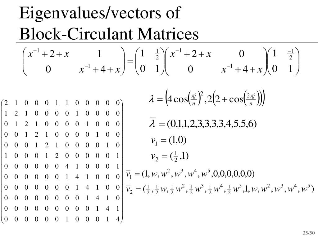 Eigenvalues/vectors ofBlock-Circulant Matrices • Find eigenvalues/vectors of block matrix • Eigenvalues of block matrix are eigenvalues of expanded matrix evaluated at eigenvectors eigenvalues inverse of eigenvectors