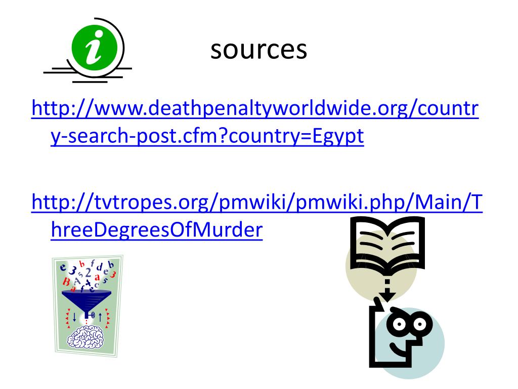 sources http://www.deathpenaltyworldwide.org/country-search-post.cfm?country=Egypt http://tvtropes.org/pmwiki/pmwiki.php/Main/ThreeDegreesOfMurder