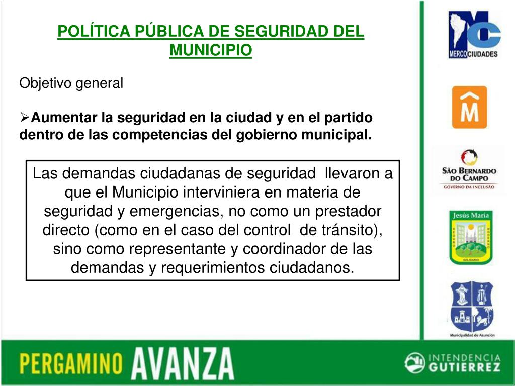 POLÍTICA PÚBLICA DE SEGURIDAD DEL MUNICIPIO • Objetivo general • Aumentar la seguridad en la ciudad y en el partido dentro de las competencias del gobierno municipal. Las demandas ciudadanas de seguridad llevaron a que el Municipio interviniera en materia de seguridad y emergencias, no como un prestador directo (como en el caso del control de tránsito), sino como representante y coordinador de las demandas y requerimientos ciudadanos.