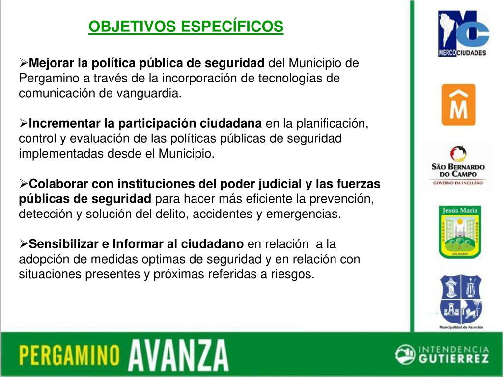 OBJETIVOS ESPECÍFICOS • Mejorarla política pública de seguridad del Municipio de Pergamino a través de la incorporación de tecnologías de comunicación de vanguardia. • Incrementar la participación ciudadana en la planificación, control y evaluación de las políticas públicas de seguridad implementadas desde el Municipio. • Colaborar con instituciones del poder judicial y las fuerzas públicas de seguridad para hacer más eficiente la prevención, detección y solución del delito, accidentes y emergencias. • Sensibilizar e Informar al ciudadano en relación a la adopción de medidas optimas de seguridad y en relación con situaciones presentes y próximas referidas a riesgos.