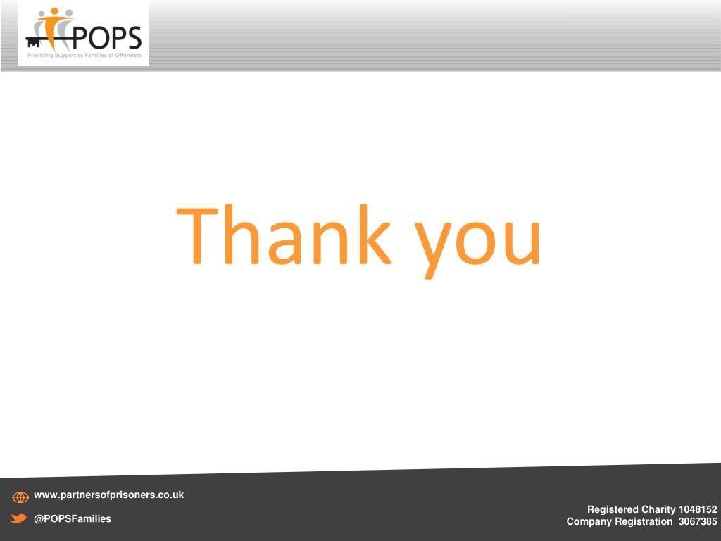 POPS Who are we? • POPS was founded 25 years ago by families of prisoners • 90 staff, over a90volunteers, circa £2 million turnover • POPS currently provide a “Continuum of Care” service to families of offenders