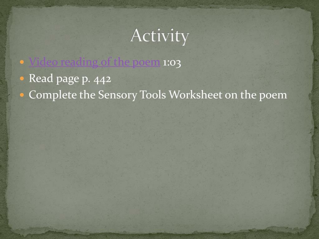 Activity • Video reading of the poem1:03 • Read page p. 442 • Complete the Sensory Tools Worksheet on the poem