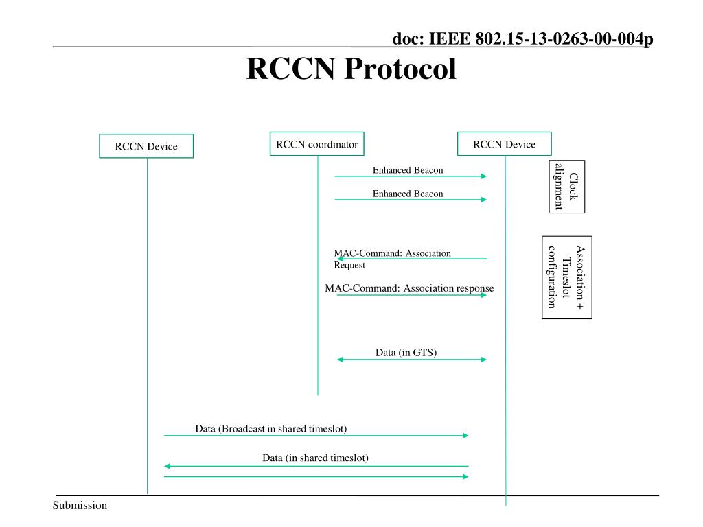 RCCN Protocol RCCN coordinator RCCN Device RCCN Device Enhanced Beacon Clock alignment Enhanced Beacon MAC-Command: Association Request Association + Timeslot configuration MAC-Command: Association response Data (in GTS) Data (Broadcast in shared timeslot) Data (in shared timeslot)