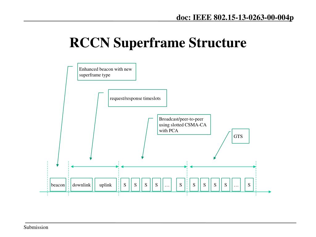 RCCN Superframe Structure Enhanced beacon with new superframe type request/response timeslots Broadcast/peer-to-peer using slotted CSMA-CA with PCA GTS shared group timeslots bidirectional timeslots management timeslots beacon downlink uplink S S S S … S S S S S … S time