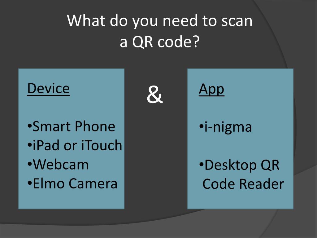 What do you need to scan a QR code? • Device • Smart Phone • iPad or iTouch • Webcam • Elmo Camera & • App • i-nigma • Desktop QR • Code Reader