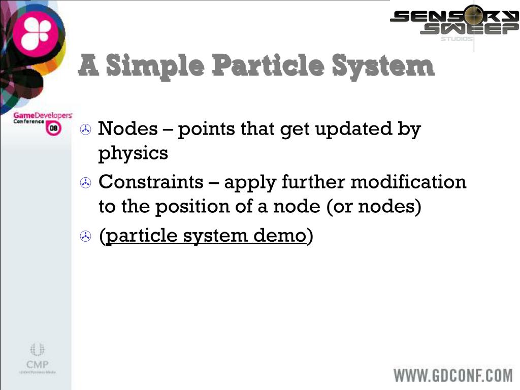 A Simple Particle System • Nodes – points that get updated by physics • Constraints – apply further modification to the position of a node (or nodes) • (particle system demo)