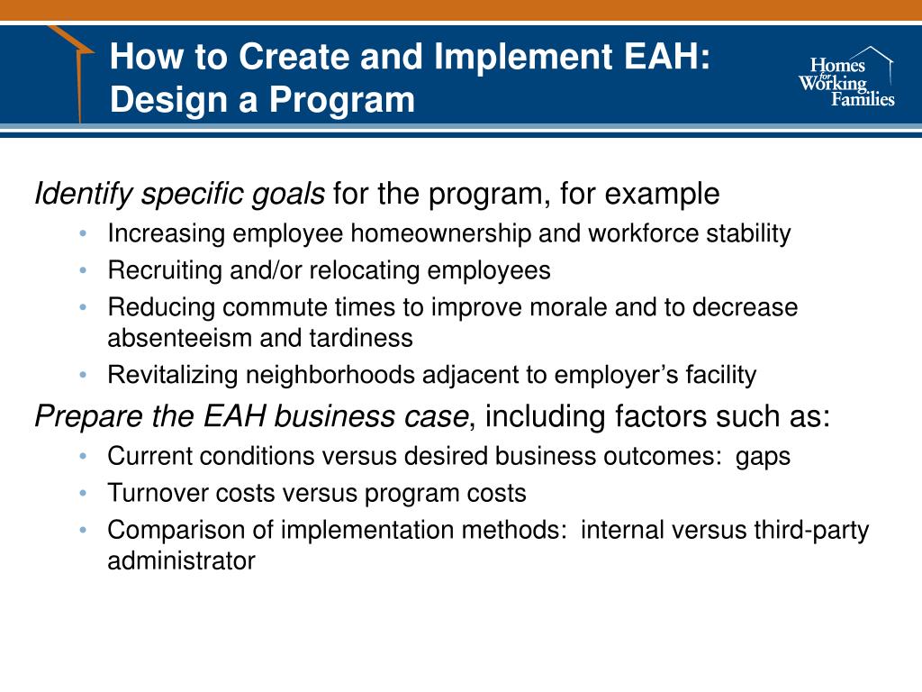How to Create and Implement EAH: Design a Program Identify specific goals for the program, for example • Increasing employee homeownership and workforce stability • Recruiting and/or relocating employees • Reducing commute times to improve morale and to decrease absenteeism and tardiness • Revitalizing neighborhoods adjacent to employer’s facility Prepare the EAH business case, including factors such as: • Current conditions versus desired business outcomes: gaps • Turnover costs versus program costs • Comparison of implementation methods: internal versus third-party administrator