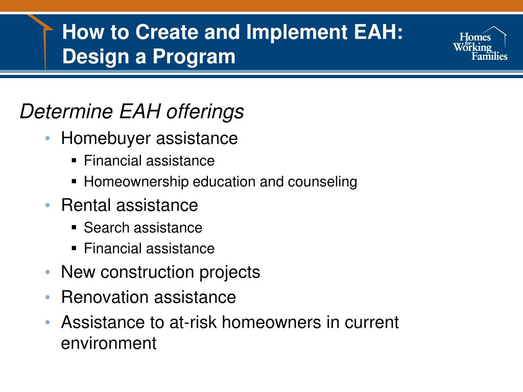 How to Create and Implement EAH: Design a Program Determine EAH offerings • Homebuyer assistance • Financial assistance • Homeownership education and counseling • Rental assistance • Search assistance • Financial assistance • New construction projects • Renovation assistance • Assistance to at-risk homeowners in current environment